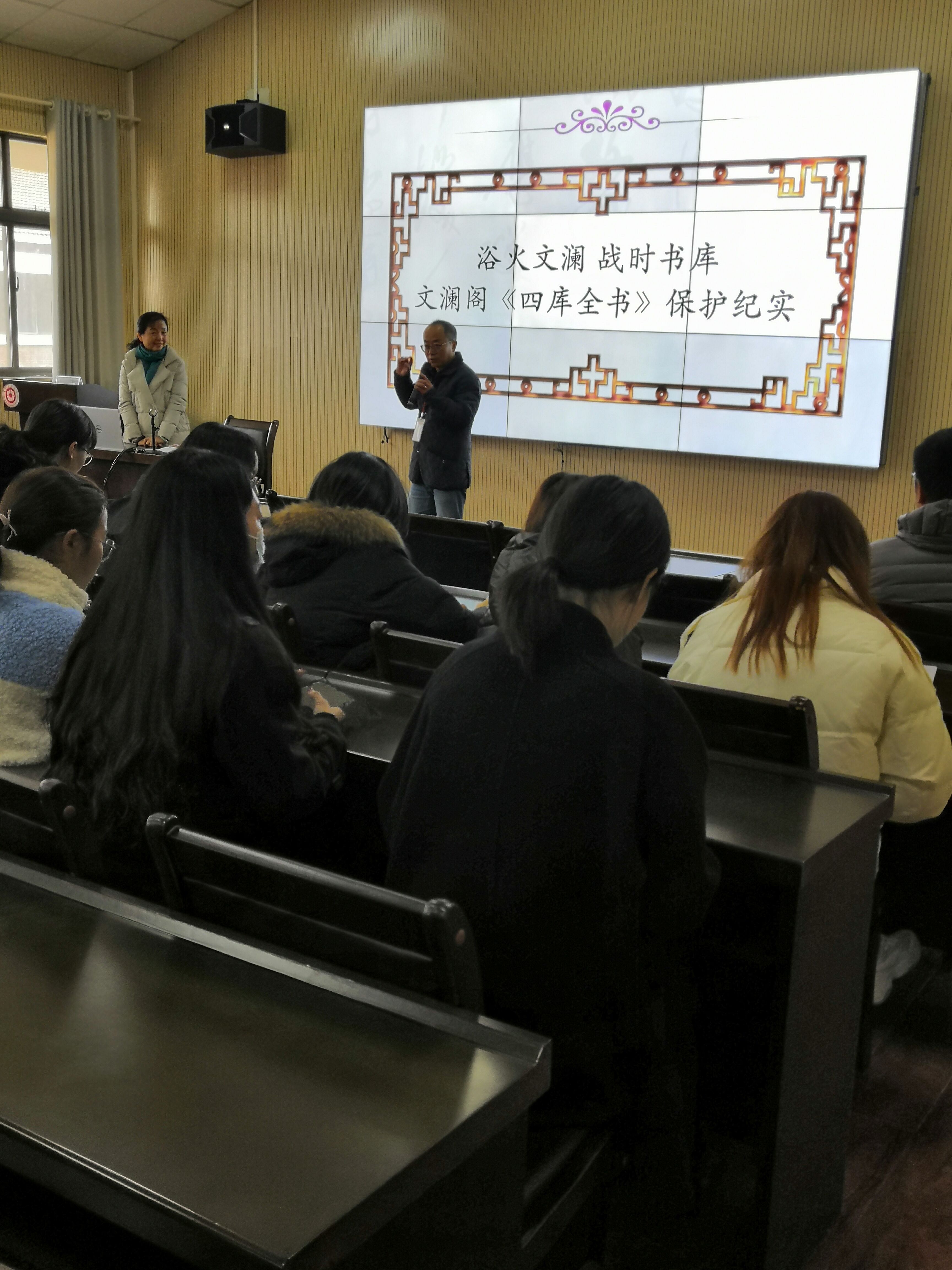 2020年11月27日下午,贵州省图书馆学会秘书长钟海珍教授在公司志学楼506报告厅作了以“浴火文澜 战时书库--《四库全书》秘藏贵阳纪实”为主题的鼎新讲堂系列讲座。讲座由威廉体育官方网站图书馆馆长杨帆教授主持,图书情报硕士研究生导师杨溢副教授、崔鹏副教授和图书情报专业研究生参加了此次讲座。