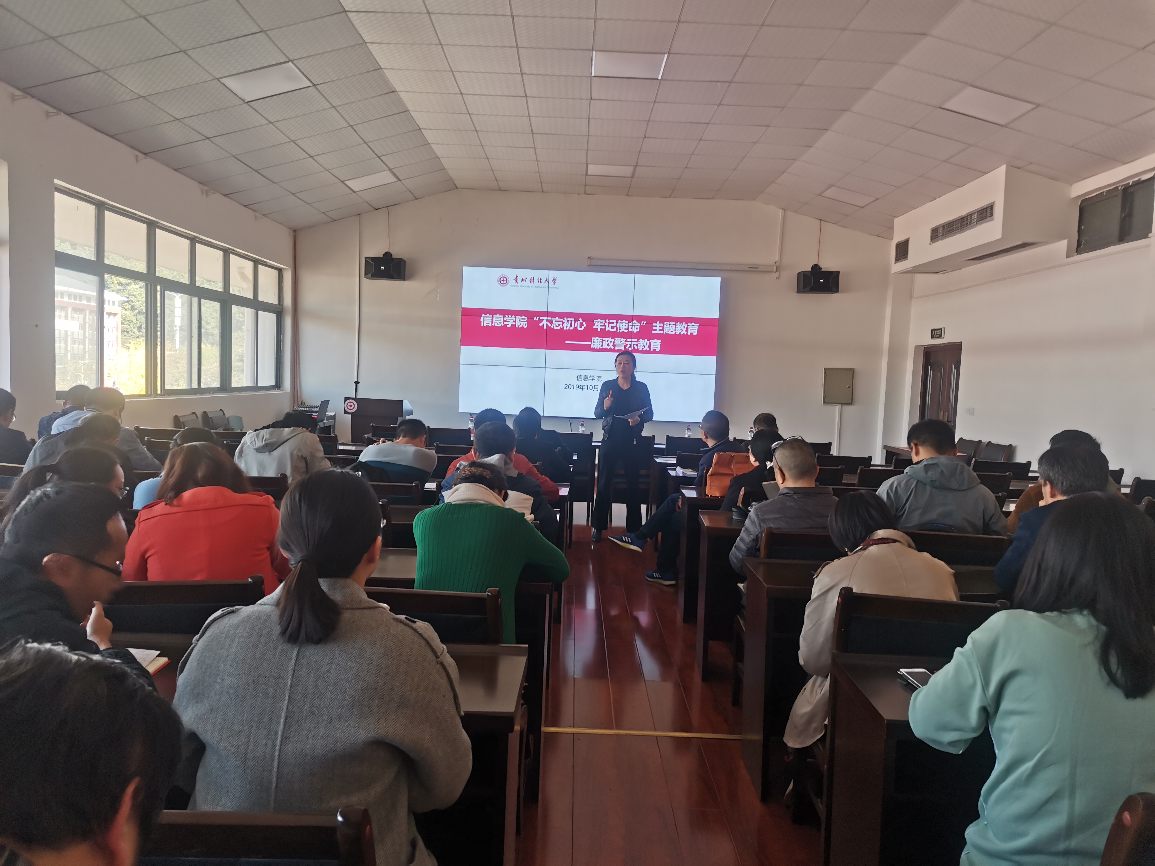 本网讯:(王游滨 图文报道)10月29日下午,威廉体育官方网站在志学楼506开展“不忘初心、牢记使命”主题教育廉政警示教育暨第二十三次政治理论学习,公司党委书记卿春、公司党委副书记何瑞、副经理陈琴及全体教职工参加。