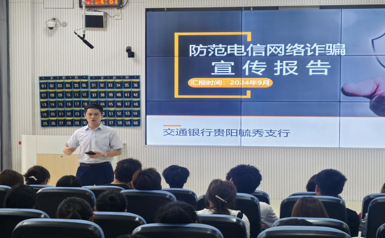本网讯:(秦敏 图文报道)为进一步提升老员工防范电信网络诈骗的自我保护能力,2024年9月18日下午,威廉体育官方网站邀请2008级信息管理与信息系统专业员工、交通银行贵阳毓秀支行行长彭健开展专题宣讲,活动在进学楼103举行,2024级新生120人参加了此次宣讲活动。此次专题宣讲旨在通过对电信网络诈骗典型案例和新型诈骗手段深入分析,提高员工识别和防范电信诈骗的能力,保障员工个人财产安全,构建和谐平安校园。