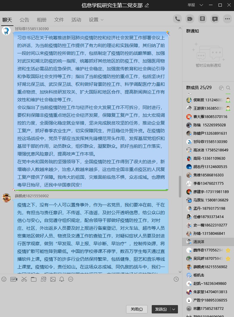 最后,支部书记王游滨做总结发言并对支部党员提出了三点要求。一是疫情期间学习不掉队,不仅要抓紧专业课的学习,更不能放松政治理论的学习;二是发挥好党员的先锋模范作用,做好个人防护,服从组织管理,向抗疫先锋看齐;三是坚守意识形态阵地,疫情期间,作为研究生党员坚决做到不造谣、不传谣、不信谣。